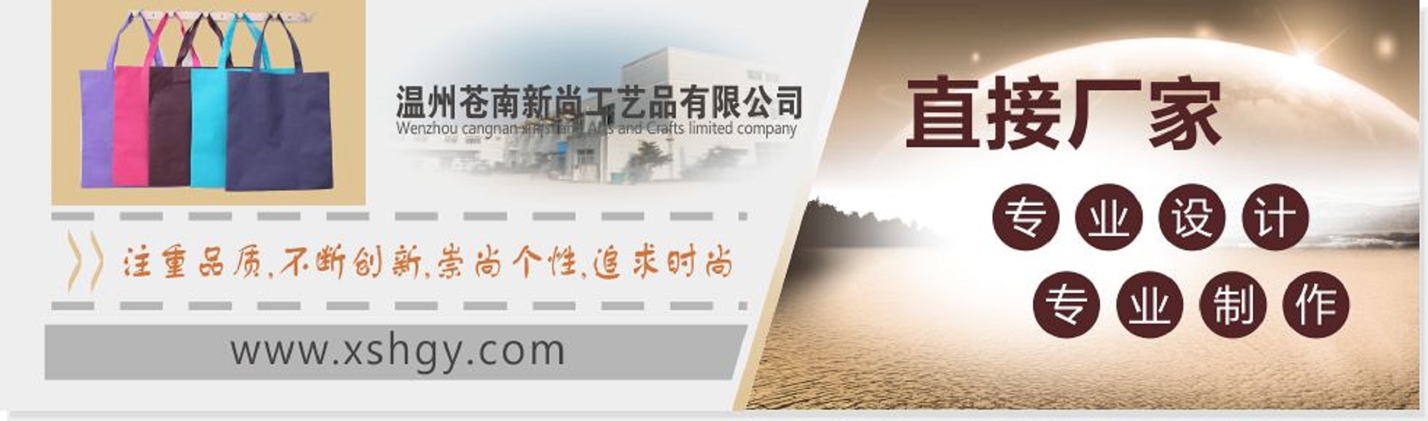 公司原名蒼南縣新尚制袋廠,座落于素有“中國印刷城”和“中國禮品城”的龍港鎮,近鄰“中國紡織城”的宜山鎮,以及“中國箱包城”的錢庫鎮,有利的地理條件下保證了產品的質量和快捷的運輸條件。公司是一家集設計、研發、生產、銷售為一體的工藝品生產型企業,多年來一直專注于布藝制品的定制與開發,擁有多名高級設計師,具有良好的職業素養和創意天賦,將為您打造完美的專屬布藝包裝作品。我們擅長的產品有: 棉布袋、帆布袋、麻布袋、絨布袋、牛津布袋、環保袋等。?